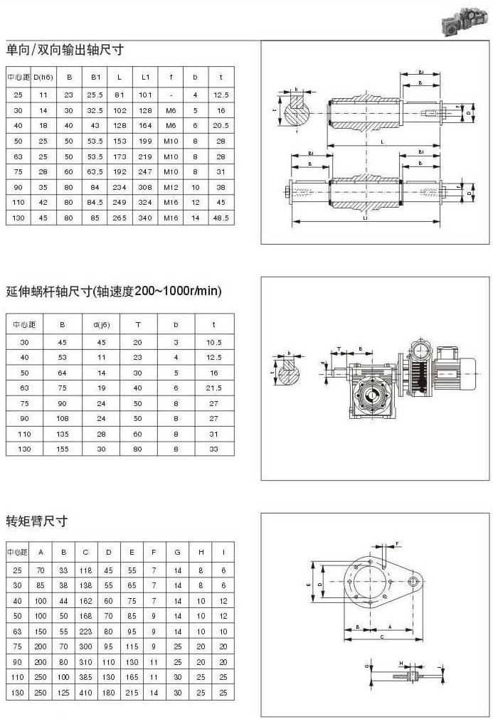 单向/双向输出轴尺寸延伸蜗轮轴尺寸(轴速度200-100r/min)转矩臂尺寸