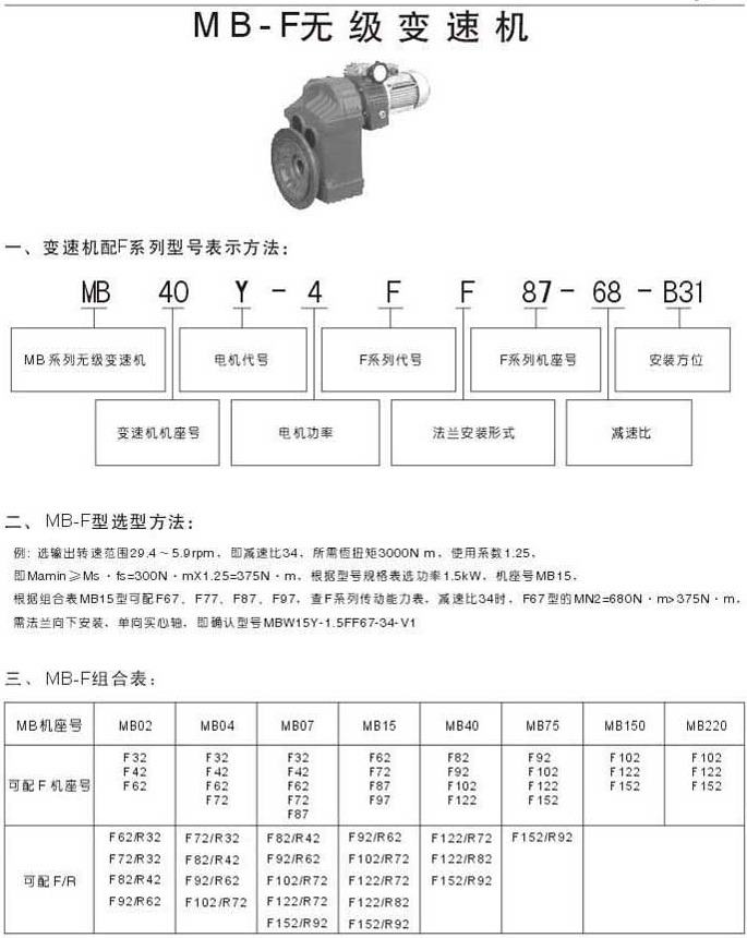 MB-F无级变速机变速机配F系列型号表示法MB-F选型方法MF组合表