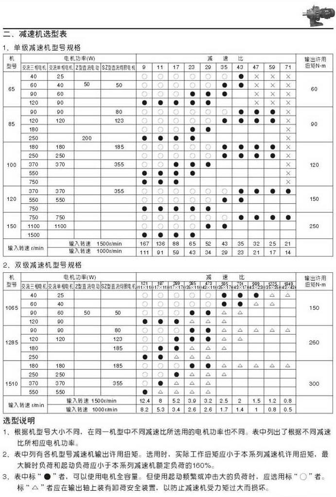 WB系列摆线针轮减速机选型表单级减速机型号规格表双级减速机型号规格表选型说明