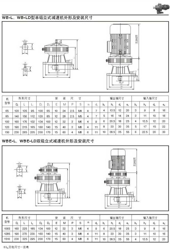 WB-L . WB-LD型单级立式减速机外型图,安装尺寸WBE-L . WEB-LD双级立式减速机外型图,安装尺寸